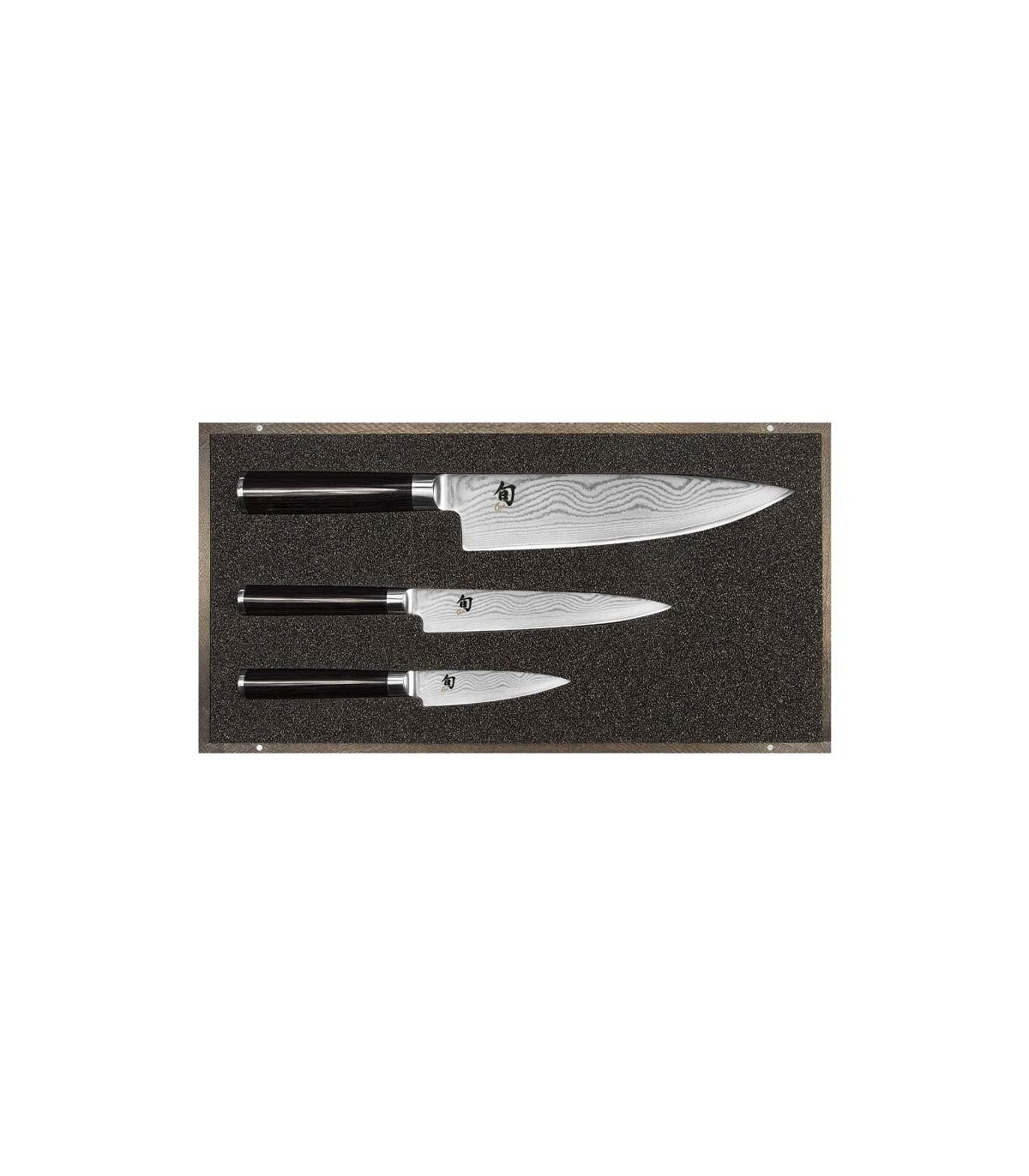 Et si 3 des plus grands couteaux issus des forges japonaises étaient réunis dans un seul et même coffret ? Cai désormains chose faîte, par le biais de la marque japonaise Kaï qui nous gratifie dun superbe lot de 3 couteaux de la gamme Shun Damas. Ce set de haut vol se révèle être indispensable pour votre cuisine. 3 lames indispensables, lOfficepetit et fonctionnel, un éminceur de choix pour le gros et un 10 cm pour travailr ses filets, couper ses légumes. Le kit ultime pour travailr ses produits frais. Choisissez le meilleur des couteaux japonaisen achetant ce kit 3 couteaux Kaï. Prenez soin de votre couteau: il est important de toujours laver et de sécher votre couteau après chaque utilisation. Attention leurs manches en bois supportent mal le lave-vaisselle. Prenez soin de ces couteaux, ils vous le rendront au centuple !