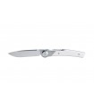 La participation et la maîtrise de la Société Actilam ont permis de réaliser ce couteau d'une superbe ligne élancée et d'un aspect personnalisé avec ses désigners J.P. Sucheras et P. Jodas. Actilam manifeste une implication évolutive à la créativité de ces couteaux. Sa superbe lame forgée en acier 4116N est dotée dun système de verrouillage à manipulation intuitive. Son paradoxal manche de 11 cm est constitué de plaquettes en corian blanc, en fibre carbone noir ou en bois dolivier. Un ressort hélicoïdal finement guilloché matérialise cette conception.