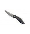 Couteau MKM « RAUT » par VIPER, lame acier M390 Bohler finition « stonewashed » avec « flipper », manche 12 cm titanium 6AL4V bleu avec plaquettes fibre de carbone noir, avec clip titanium bleu. Pochette nylon.