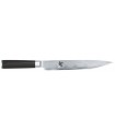 Arrêtons nous un instant afin de vous présenter ce superbe couteau à trancher de la gamme shun damas de la marque de couteaux japonais Kaï. Ce couteau est utile dès lors que l'on souhaite trancher ses préparations culinaires, ainsi vous ne subirez plus jamais de résistance pour couper vos rôtis, vos jambons et pour toute autre viande ! Sa lame en acier damas Inox est disponible en deux tailles 18 cm. Cet acier très dur, est particulièrement résistant à la corrosion.La série shun damas remporte un large succès auprès des cuisiniers les plus exigeants Utilisation : Ce couteau à trancher ne se lave pas au lave vaisselle.
