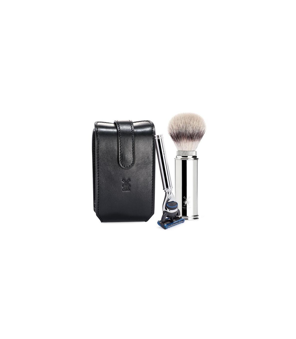 3 pièces, manche du Rasoir et monture du blaireau formant étui en métal chromé, comprenant : - un blaireau fibre synthétique argentée (silvertip fibre®) (réf. 31M20). - un Rasoir Fusion (réf. R20F). - un étui en cuir noir IMPORTANT :La garantie ne s'applique que si, après usage, les blaireaux ont été lavés à l'eau douce (température maximale : 45 degrés) et essuyés soigneusement, puis séchés à l'air libre (tête en bas). Si ces consignes ne sont pas respectées, les poils des blaireaux se cassent et la garantie n'est alors pas engagée.